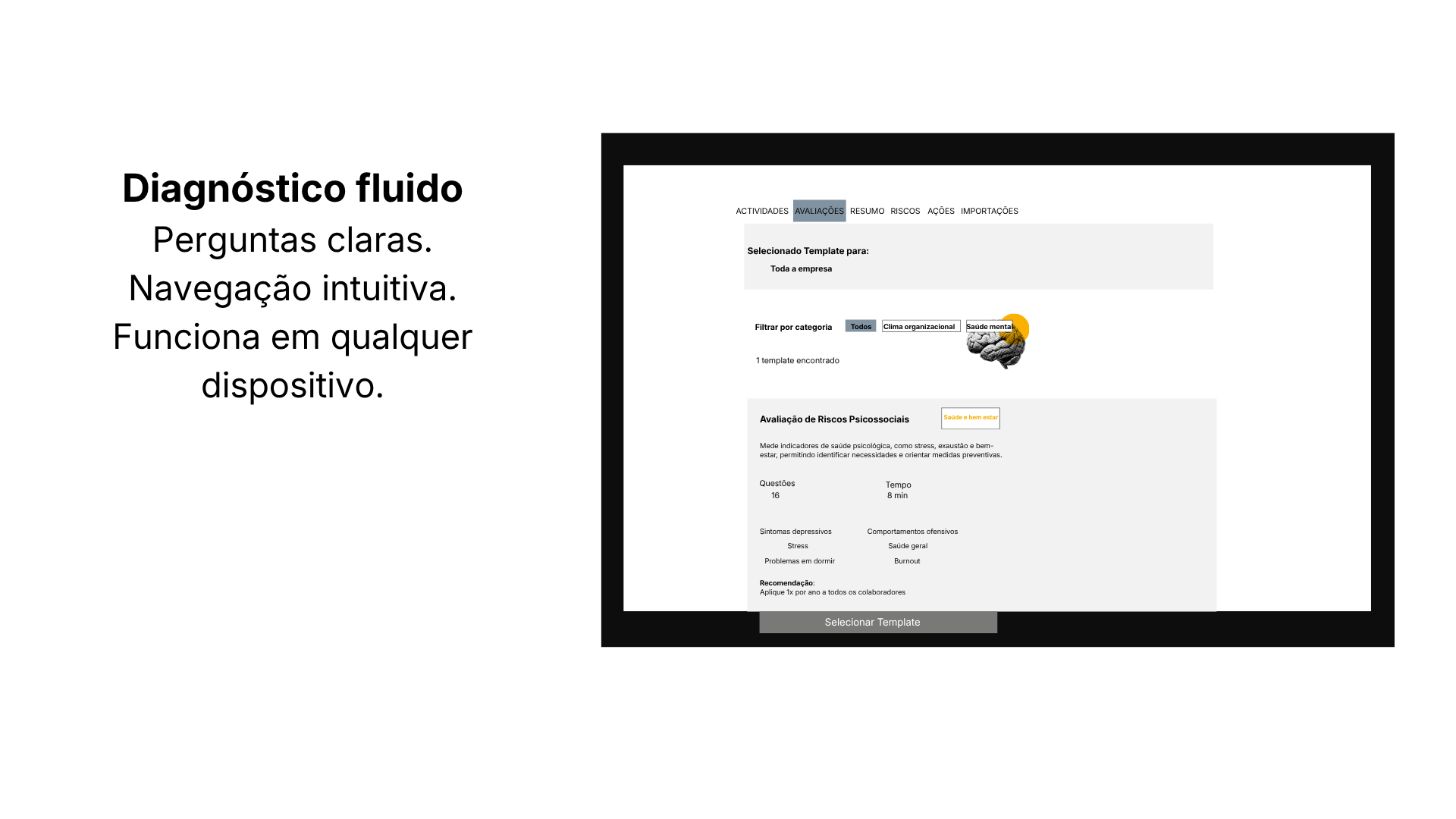 Regista equipas e responsáveis, envia os questionários aos colaboradores e a plataforma consolida as respostas, identificando os principais riscos por área. Com base nisso, recebe um diagnóstico claro e um plano de ação para começar a atuar com as lideranças.