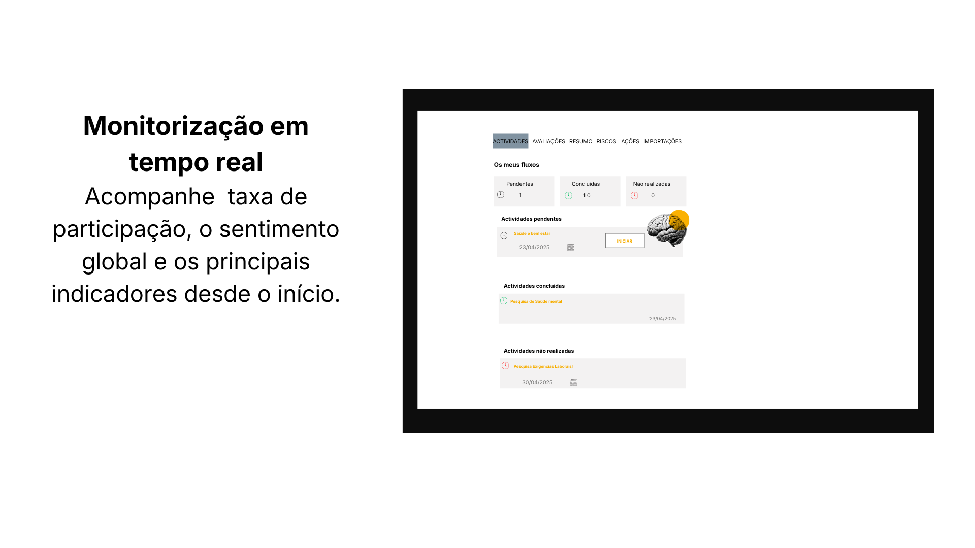 É uma Solução que avalia riscos psicossociais, sinaliza prioridades e orienta planos de ação por empresa e equipa.
